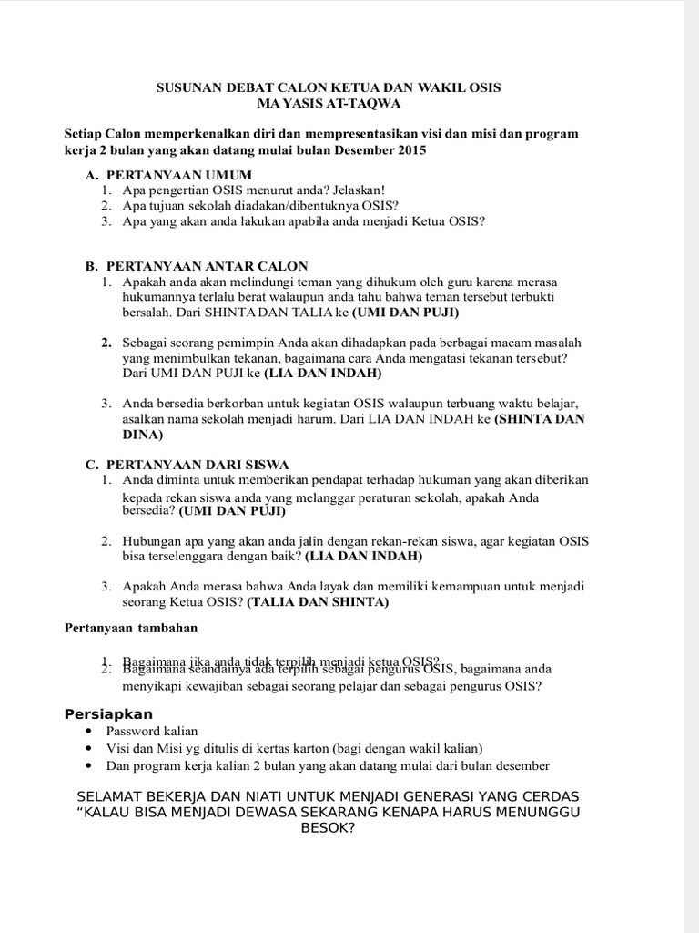 Pertanyaan Untuk Pemilihan Pengurus Osis - Naskah mc debat kandidat osis.