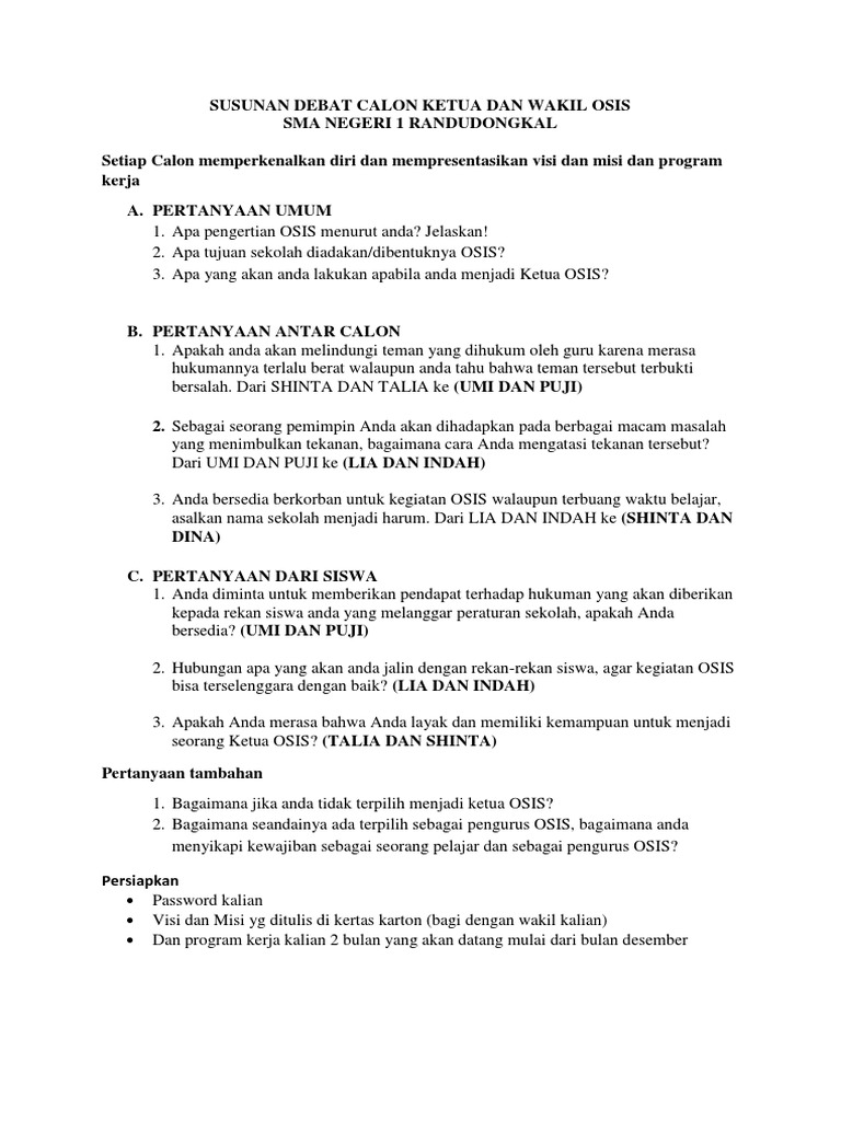 Pertanyaan Untuk Calon Ketua Osis / Demikianlah visi dan misi saya sebagai ketua osis. Pertanyaan Untuk Calon Ketua Osis - Tapi bagaimana caranya membuat kegiatan untuk siswa, staf sekolah, bapak ibu guru?